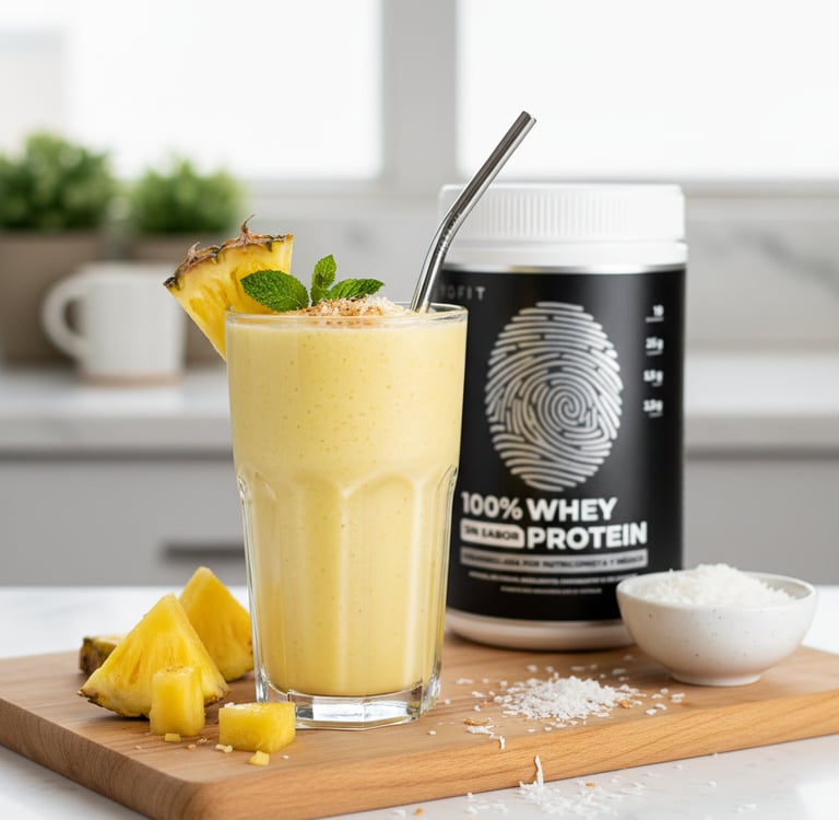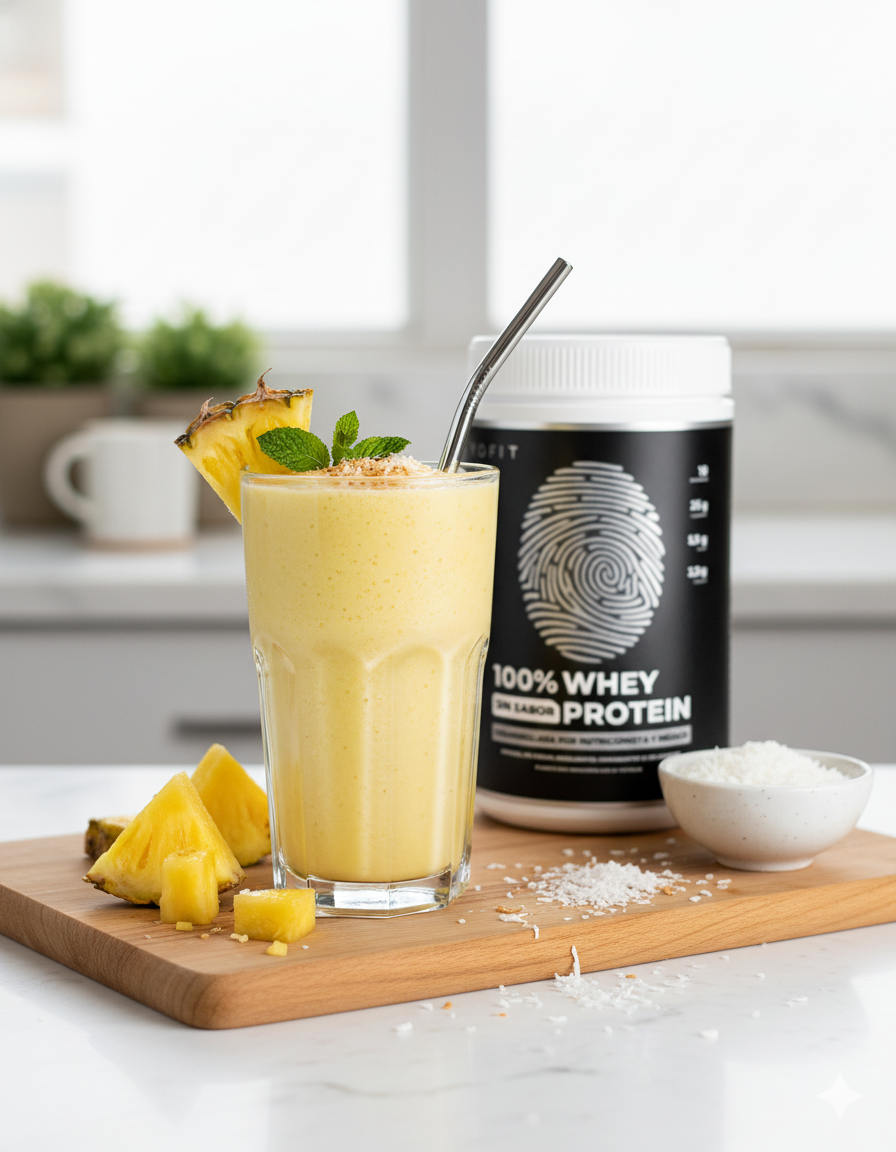 🍽️ 1 porción | 💪 32 g proteínas | ⏱️ 10 min Exquisita receta para refrescarte con piña, coco y la mejor proteína